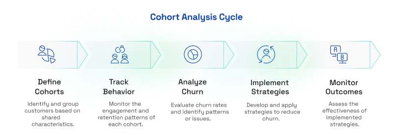 Cohort analysis groups customers based on shared characteristics (such as sign-up date, product usage, or demographics) to track their behavior over time. Instead of looking at customers as a whole, this method helps businesses analyze how different segments churn at different stages.